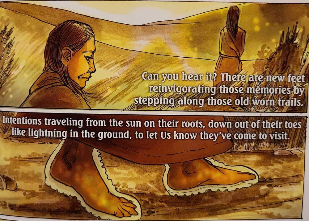 The group shared how Native people have used sequential art in basketry, regalia, and traditional architecture to tell stories and convey who we are and why we are here. The sisters Theresa, Mona, and Kelly are all talented basket weavers; this was likely the first time in SDCC history that Native basket weavers presented at the con. The panel was titled “Indigenous Comics & Basket Weaving: Centuries of Stories.